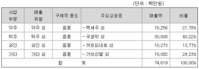 당사는 엄선된 원료와 우수한 발효기술을 바탕으로 전통주를 생산하여 판매하고 있습니다. 당사에서 생산하여 판매하고 있는 제품은 백세주, 강장백세주, 예담, 국순당생막걸리, 국순당쌀막걸리, 대박 등입니다. 제품별 매출액 및 비중은 다음과 같습니다.