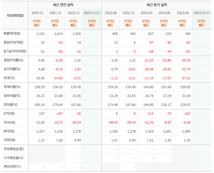 2022년 매출은 1526억, 영업이익은 19억, 당기순이익은 -16억입니다. 그리고 영업이익률은 1.26%입니다.