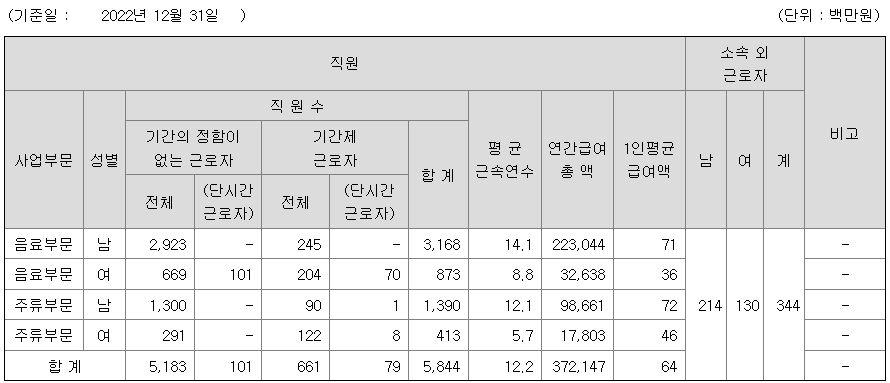| 음료부문 | 남 | 3,168 | 14.1 | 71 |