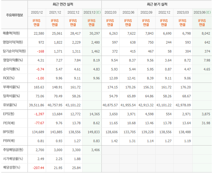 2022년 실적은 2조 8417억, 영업이익은 2229억입니다. 그리고 영업이익률은 6.40%입니다.