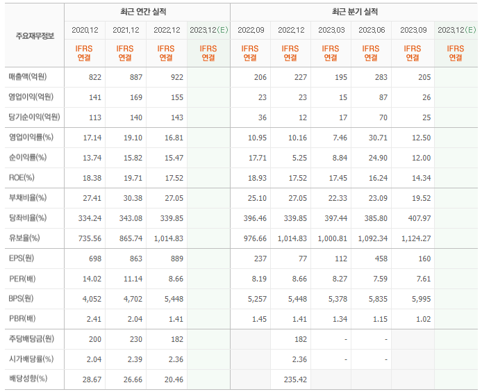 2022년 매출은 922억, 영업이익은 155억, 당기순이익은 143억입니다. 그리고 영업이익률은 16.81%입니다.
