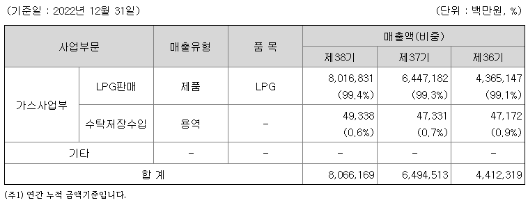 당사는 LPG 수입산업의 합리화를 위해 1985년 설립되어 현재까지 LPG 등의 화학제품을 수입, 저장, 판매하는 LPG 가스사업을 주요 사업으로 영위하고 있으며, 2022년 누적 회사 총매출액인 8.1조원 전액을 LPG 가스사업에서 창출하였습니다. 이중 국내 매출은 5.2조원으로 약 64%, 해외수출은 2.9조원으로 약 36%를 차지하고 있습니다.