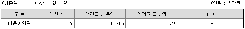 미등기임원의 평균연봉은 4억 900만원이고 직원수는 28명입니다.