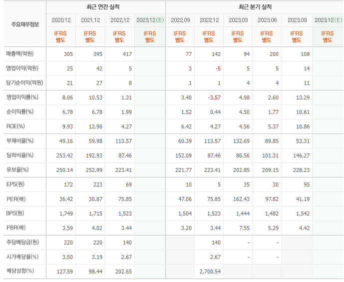 2022년 매출은 417억, 영업이익은 5억, 당기순이익은 8억입니다. 그리고 영업이익률은 1.31%입니다.