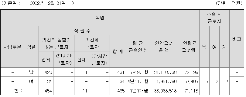 남성의 평균연봉은 7219만원이고 직원수는 431명, 여성은 5740만원이고 직원수는 34명입니다. 전체 평균연봉은 7111만원이고 직원수는 465명입니다.