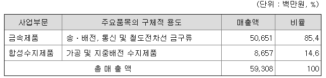 제룡산업주식회사는 "시장 친화적인 기술선도 강소기업"의 경영이념 아래 송전자재, 배전자재, 지중선자재, 통신기자재, 철도자재를 제조 판매하는 기업으로서 원자재의 성격, 제품 및 제조공정의 특징 등을 고려하여 당사의 사업부문을 금속제품과 합성수지제품으로 구분하였습니다.