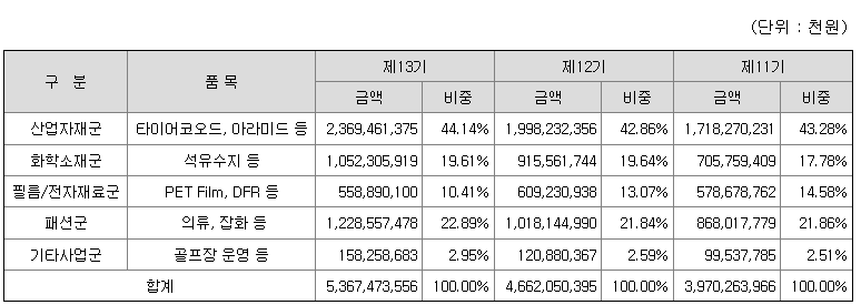 당 지배회사 및 주요종속회사의 각 사업부문별 주요 제품들의 품목 및 매출액 비중 등은 다음과 같습니다.