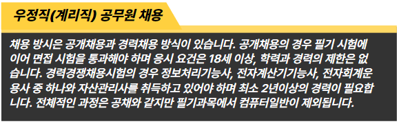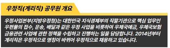 우정사업본부(지방우정청)는 대한민국 지식경제부의 직할기관으로 핵심 업무인 우편물의 접수, 운송, 배달과 같은 우정 사업을 비롯하여 우체국예금, 우체국보험 금융관련 사업에 관한 정책을 수립하고 진행하는 일을 담당합니다. 2014년부터 계리직은 우정직으로 명칭이 바뀌어 우정직으로 채용하고 있습니다.