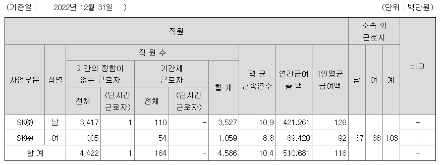 | 사업부문 | 성별 | 직원수 | 평균근속연수 | 평균연봉(백만) |