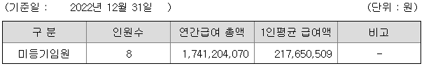미등기임원의 평균연봉은 2억 1700만원이고 직원수는 8명입니다.