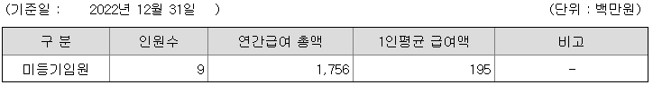 미등기임원의 평균연봉은 1억 9500만원이고 직원수는 9명입니다.