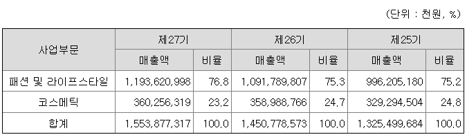 당사는 패션 및 라이프스타일과 코스메틱 사업을 전개하고 있으며, 꾸준한 사업 확장을 통해 지속적으로 성장할 수 있는 포트폴리오를 구축해 가고 있습니다. 1996년 해외 유명 패션 브랜드를 수입해 국내에 유통하는 사업을 시작하여 업계 최고의 해외 브랜드 운영 노하우를 보유하고 있으며, 1998년 보브(VOV)를 인수해 여성 캐주얼 브랜드로 리뉴얼하여 자체 패션 사업으로 영역을 확대했습니다. 자체 패션 브랜드 보브, 지컷, 델라라나, 일라일 등은 국내 주요 백화점 대표 브랜드로서 많은 고객들에게 사랑 받고 있습니다.