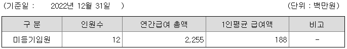 미등기임원의 평균연봉은 1억 8800만원이고 직원수는 12명입니다.