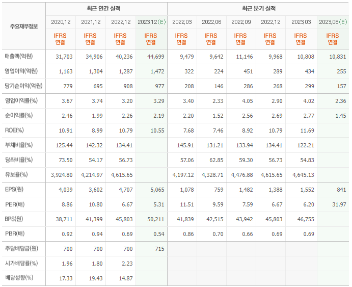 2022년 실적은 4조 236억, 영업이익은 1287억입니다. 그리고 영업이익률은 3.20%입니다.
