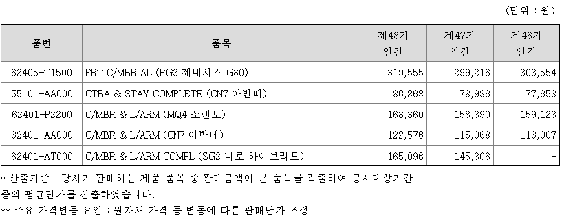 당사 및 연결대상 종속회사는 자동차 조향장치의 주요 구성품인 Member, Control arm, CTBA 및 차체를 구성하는 Fuel tank, 판넬 등을 생산하고 있습니다. 각 제품별 매출액 및 총 매출액에서 차지하는 비율은 다음과 같습니다.