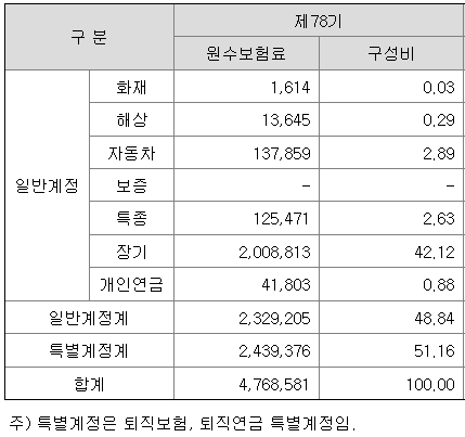 제78기 당사는 일반, 자동차보험의 질적 개선 및 장기보험 중심의 성장을 바탕으로 전년 대비 2.6% 성장한 2조 3,292억원의 원수보험료를 거수하였습니다. 보험종목별로는 일반보험은 전년 대비 24.6% 감소한 1,407억, 자동차보험은 24.3% 감소한 1,379억, 장기보험은 7.9% 성장한 2조 506억을 거수하였습니다. 총자산은 17조 9,258억을 기록하였으며, 장기보험 매출확대에 따른 일시적인 판매비 증가와 금융시장 여건 악화에 따른 금융자산 평가손실 등으로 인하여 631억원의 당기순손실을 기록하였습니다.