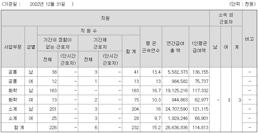 | 사업부문 | 성별 | 직원수 | 평균근속연수 | 평균연봉(백만) |