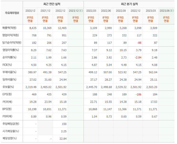2022년 매출은 1조 2465억, 영업이익은 951억, 당기순이익은 207억입니다. 그리고 영업이익률은 7.63%입니다.