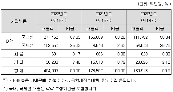 당사의 주요 제품 및 서비스는 여객운송서비스입니다. 2022년 매출액은 국내선여객운송 271,462백만원(67.0%), 국제선여객운송 102,552백만원(25.3%), 기타(화물 및 부대수익) 30,979백만원(7.6%)으로 총 404,993백만원입니다. 서비스 가격(항공권 단가)은 시장 내 경쟁상황, 계절성 수요 변동 등에 의하여 탄력적으로 변동되며 2022년 국내선54,301원/명, 국제선172,126원/명으로판매하였습니다.