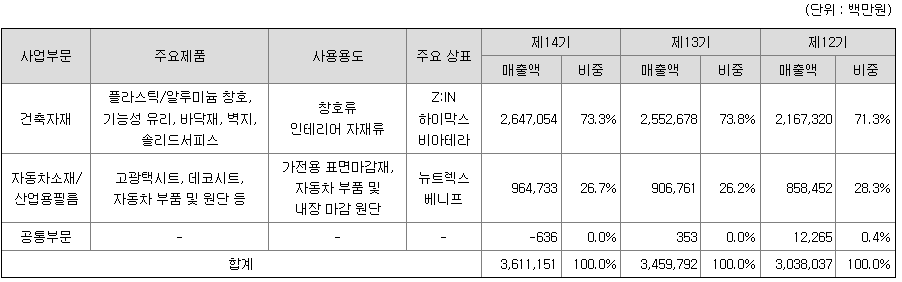 당사는 종속회사를 포함하여 건축자재 부문과 자동차소재/산업용필름 부문의 2개 사업부문으로 구성되어 있습니다.
