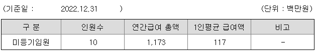 미등기임원의 평균연봉은 1억 1700만원이고 직원수는 10명입니다.