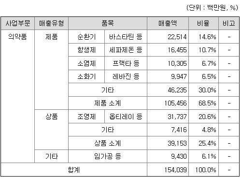 오리지널의약품은 CT용 조영제 '옵티레이' 등이 주력 제품이며, ISK[이미징솔루션코리아, (구)말린크로트코리아]와 국내 독점 공급계약을 체결하여 판매하고 있습니다. 원료의약품은 합성 및 발효 원료의약품을 판매하고 있으며, 주요 품목은 스트렙토키나제ㆍ스트렙토도르나제(이하 "SKD"라 함), 아르베카신황산염(이하 "ABK"라 함) 및 테이코플라닌 등입니다.