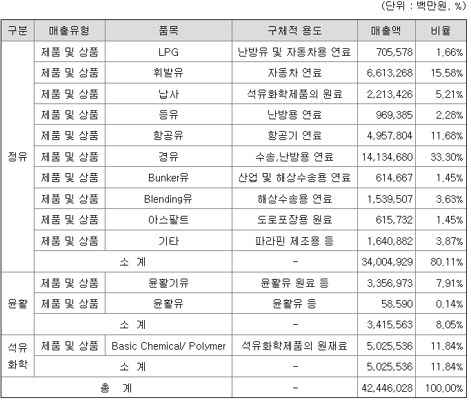 각 영업부문별 주요제품과 2022년 연결재무제표 기준 매출 현황은 아래와 같으며, 매출액 10% 이상을 차지하는 주요 매출처는 Aramco Trading Singapore Pte. Ltd.입니다.