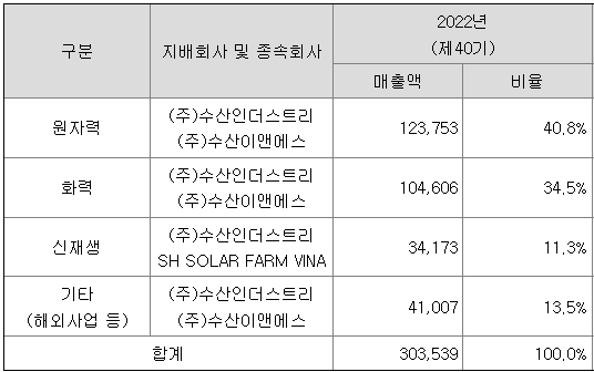 또한 당사의 연결대상 종속법인 (주)수산이앤에스는 MMIS제조 및 공급, 계측제어설비 정비사업을 영위하고 있으며, (주)에스에이치파워는 해외 종속사를 통해 태양광 발전사업을 영위하고 있습니다.