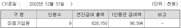 미등기임원의 평균연봉은 9800만원이고 직원수는 9명입니다.