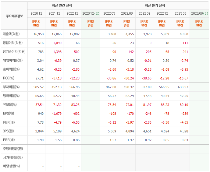 2022년 매출은 1조 7882억, 영업이익은 66억, 당기순이익은 -502억입니다. 그리고 영업이익률은 0.37%입니다.