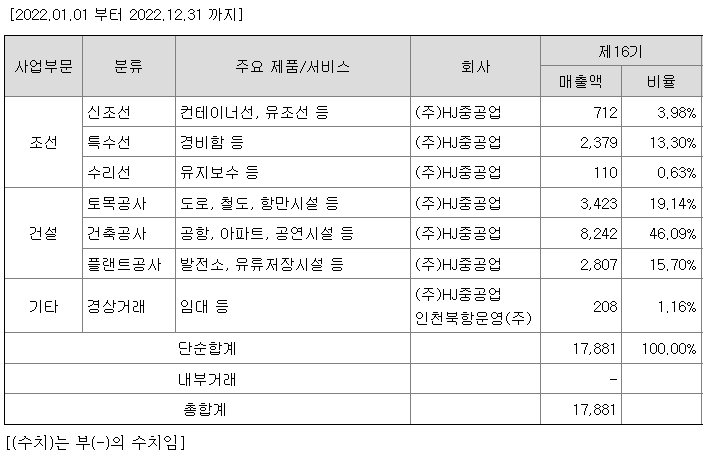 당사는 조선업과 건설업을 주요사업으로 영위하고 있습니다. 당기 기준, 조선부문의 매출은 3,201억원(17.9%), 건설부문의 매출은 14,472억원(80.9%)이며, 기타 분야의 매출은 208억원(1.2%)으로 구성되어 있습니다.