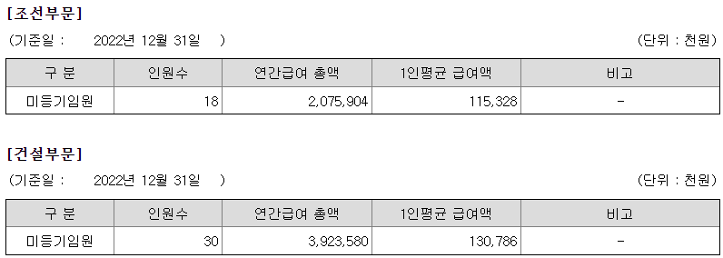 건설부문 미등기임원의 평균연봉은 1억 3000만원이고 직원수는 30명입니다.