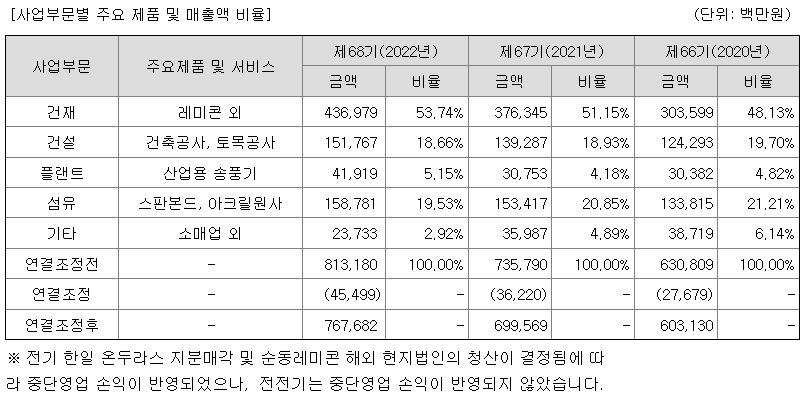 당사 주력 매출 품목은 레미콘이며, 이를 중심으로한 건자재 네트워크는 오랜 시간 축적한 전국 유통망을 구축하고 있으며, 레미콘, 골재 등 기초건자재를 넘어서 단열재, 타일, 위생도기, 석고보드 등 마감자재까지 모든 건축자재에 대해 One-Stop 서비스를 제공하고 있습니다.