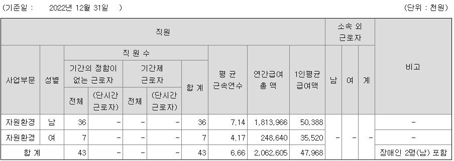 | 사업부문 | 성별 | 직원수 | 평균근속연수 | 평균연봉(백만) |