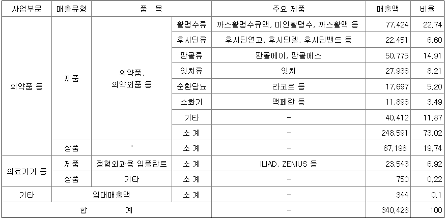 지배기업인 연결실체는 제공하는 재화나 용역에 근거하여 영업부문을 구분하고 각 부문의 재무정보를 내부관리 목적으로 활용하고 있는 바, 당사는 제약업, 의료기기 제조 및 판매업, 기타금융업을 운영하고 있습니다. 영위하는 영업부문 중 기타금융업의 경우 중요성의 관점에서 비중이 크지 않습니다.