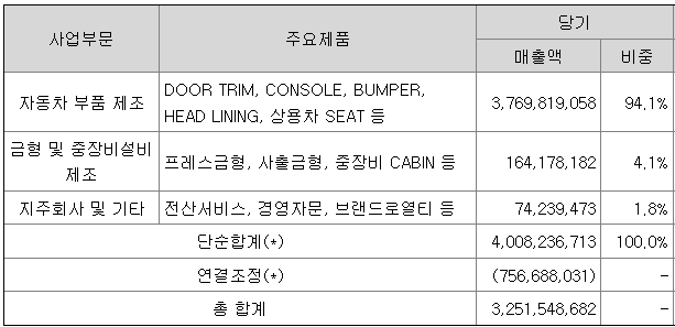 당사와 종속회사들은 지주사업, 자동차 부품 제조업, 금형 및 건설중장비 제조업 등을 영위하고 있으며 최근 3사업연도 중 각 부문별 매출액과 비율은 아래와 같습니다.