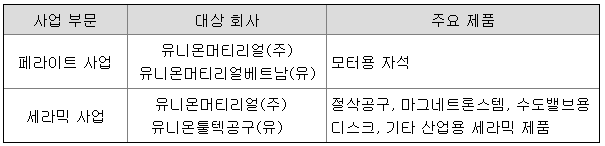 또한, 종속회사인 유니온툴텍공구(유한공사)는 세라믹제품 판매, 유니온머티리얼베트남(유한회사)는 페라이트 제조와 판매를 영위하고 있습니다.