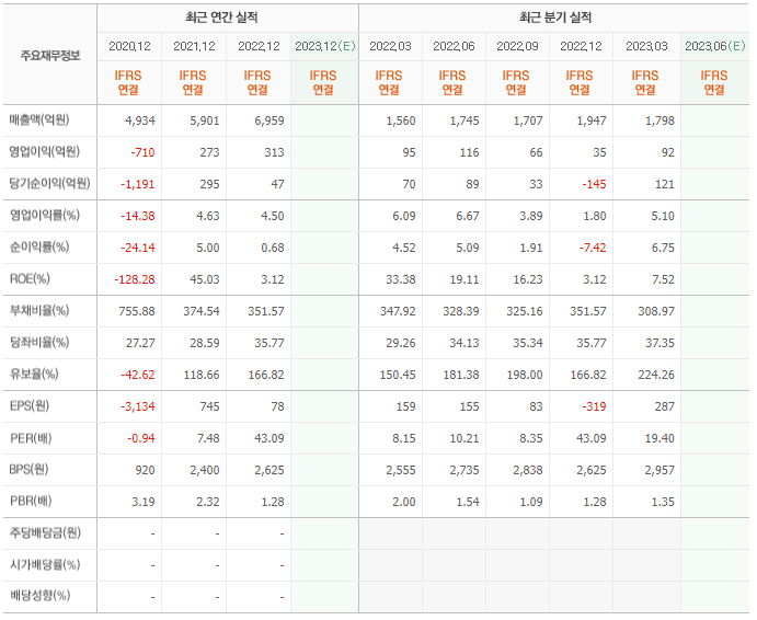 2022년 매출은 6959억, 영업이익은 313억, 당기순이익은 47억입니다. 그리고 영업이익률은 4.50%입니다.