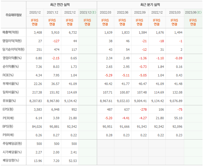 2022년 매출은 6732억, 영업이익은 44억, 당기순이익은 117억입니다. 그리고 영업이익률은 0.65%입니다.