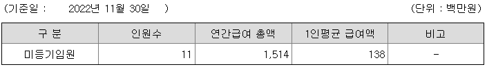 미등기임원의 평균연봉은 1억 3800만원이고 직원수는 11명입니다.