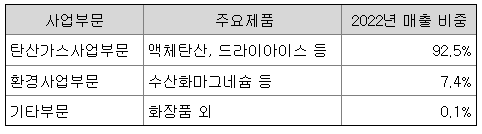 연결회사는 탄산가스를 공급받아 고순도의 액체탄산과 드라이아이스의 제조 공급,기화기 및 혼합가스의 제조 공급, 질소, 산소, 에틸렌 등의 일반가스 상품을 판매하는 가스사업부문과 수산화마그네슘, 액상소석회를 제조 공급하는 환경사업부문의 사업 등을 영위하고 있습니다.
