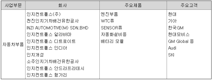 최근에는 친환경차 부품(전기차용 배터리 모듈 및 통합 열관리모듈 등) 판매를 확대하여 제품 포트폴리오 다각화와 추가적인 매출 성장을 추진하고 있습니다. 당사 및 종속회사 사업부문 현황을 요약하면 아래와 같습니다.