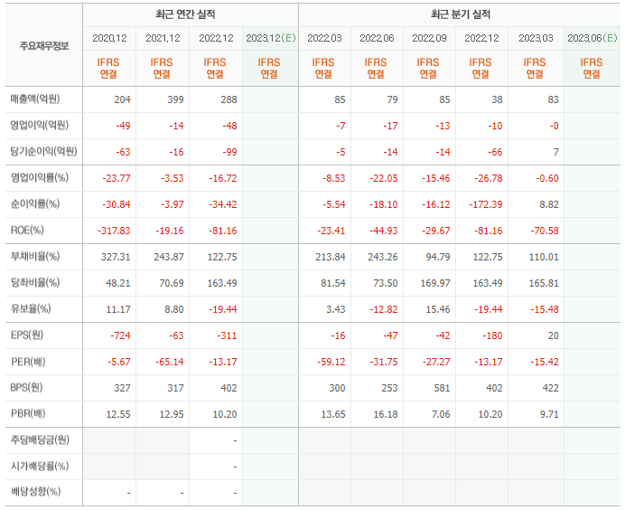 2022년 매출은 288억, 영업이익은 -48억, 당기순이익은 -99억입니다. 그리고 영업이익률은 -16.72%입니다.