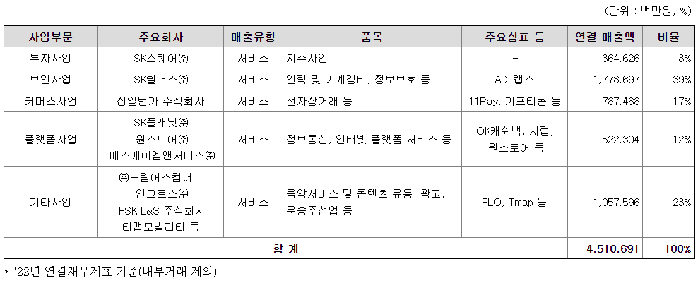SK스퀘어의 각 부문은 독립된 서비스 및 상품을 제공하는 법률적 실체에 의해 구분되어 있으며 ① 투자사업, ② 무인경비업 및 인력경비업, 시스템 소프트웨어 개발 등의 보안사업, ③ 온라인쇼핑몰 등의 커머스사업, ④ 플랫폼사업, ⑤ 기타사업부문으로 구분되어 있습니다.
