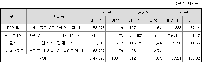 모바일게임의 경우 퍼즐, 슈팅과 같은 캐주얼 게임부터 MMORPG와 같은 하드코어 게임까지 다양한 장르의 게임을 서비스하고 있습니다. 주요 타이틀로는 '오딘: 발할라 라이징', '우마무스메: 프리티 더비', '가디언테일즈', '달빛조각사'를 비롯하여, 프렌즈 IP를 활용한 다양한 캐주얼 게임을 서비스 중에 있습니다. 모바일게임은 구글 플레이스토어, 애플 앱스토어 및 원스토어 등의 마켓을 통하여 소비자가 당사의 게임을 다운로드 받은 후 게임 이용 중 구매한 아이템을 통해 수익이 발생하며, 카카오톡 게임하기 플랫폼 서비스를 통한 판매도 이루어지고 있습니다.