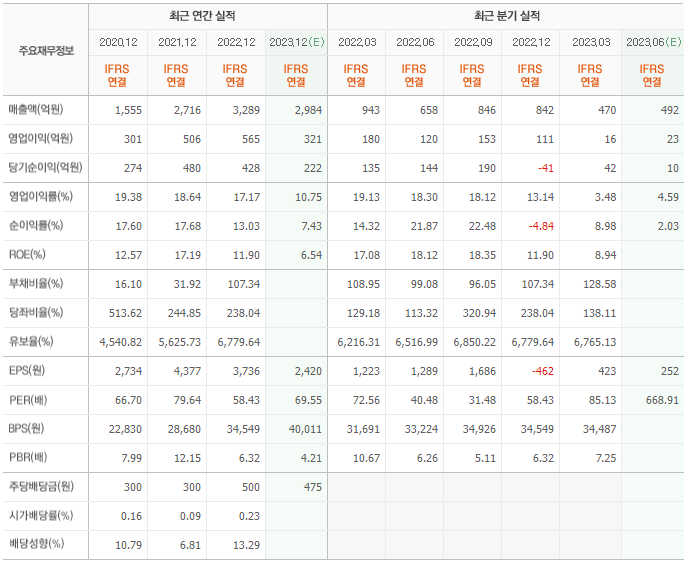2022년 매출은 3289억, 영업이익은 565억, 당기순이익은 428억입니다. 그리고 영업이익률은 17.17%입니다.