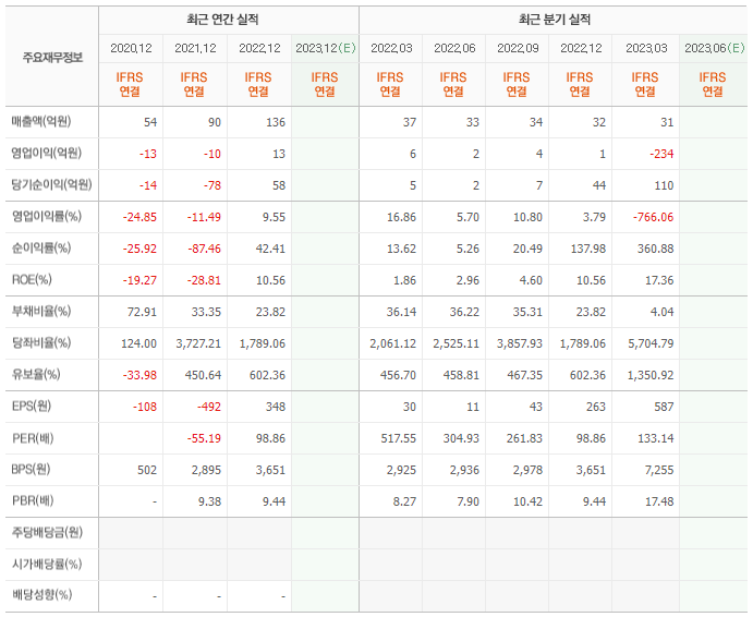 2022년 매출은 136억, 영업이익은 13억, 당기순이익은 58억입니다. 그리고 영업이익률은 9.55%입니다.