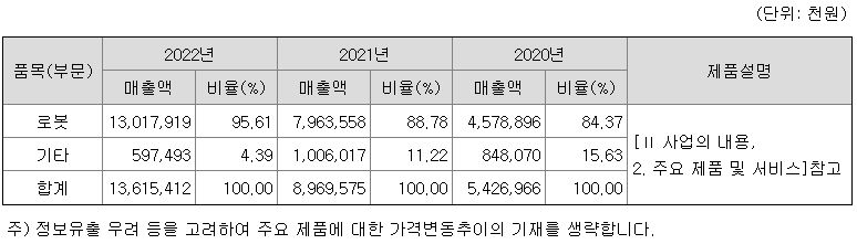 당사 로봇부문의 매출 비중은 85.6% 수준이며, 주요 거래처는 S**사와 T**사등이 있습니다.