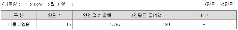 미등기임원의 평균연봉은 1억 2000만원이고 직원수는 15명입니다.