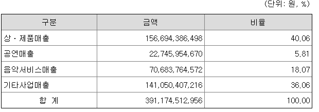 상ㆍ제품 매출에는 앨범/DVD의 판매뿐만 아니라, 온라인 상에서 소비되는 디지털콘텐츠의 매출 및 아티스트 관련 MD 매출 등이 포함되어 있습니다.